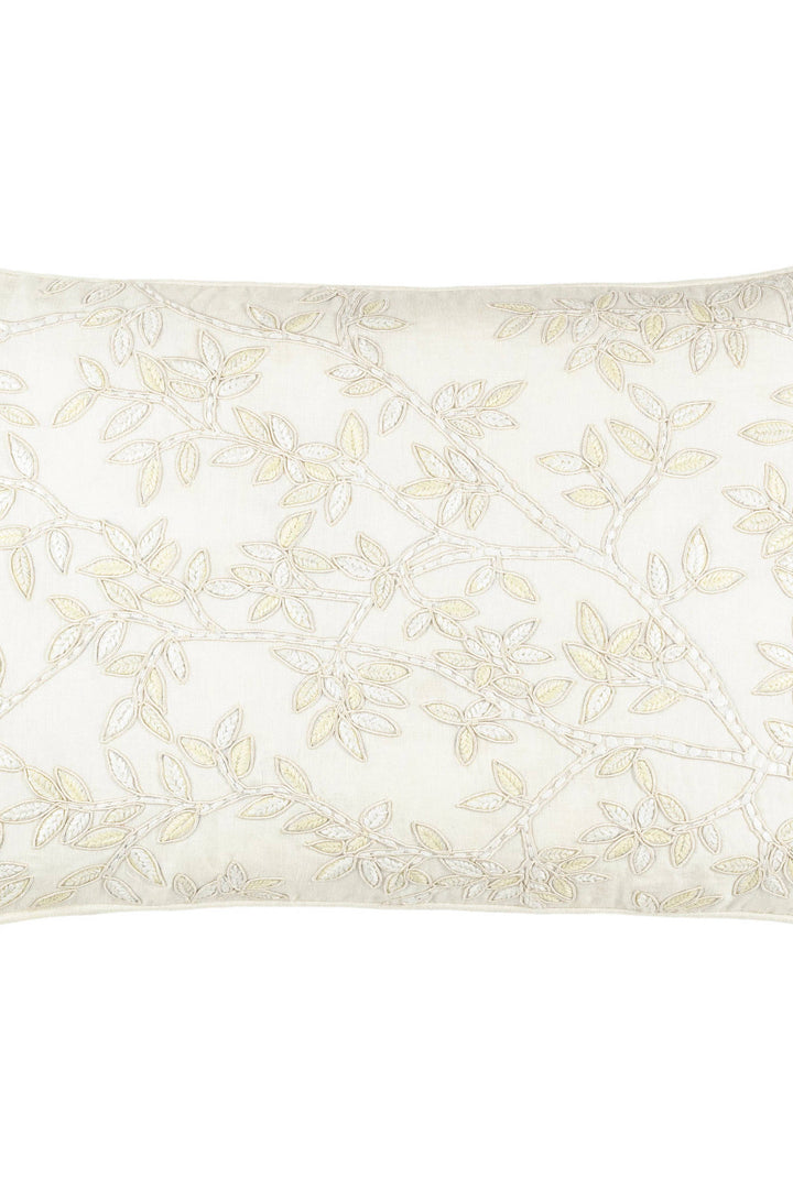 A beautifully modern pillow with a touch of yesteryear will bring a romantic element to a simply dressed bed or sofa. Adorned with a deep understory of interwoven branches, leaves, and foliage interpreted in antiqued, passementerie embroidery. The subtle sheen of the outlining cordage is further embellished by intricate stitching which contrasts the matte surface texture of the natural linen pillow. Designed for us by Marie Flanigan, an award-winning interior designer and principal of Marie Flanigan Interiors, to reflect her signature style of timeless elegance and innovative simplicity.