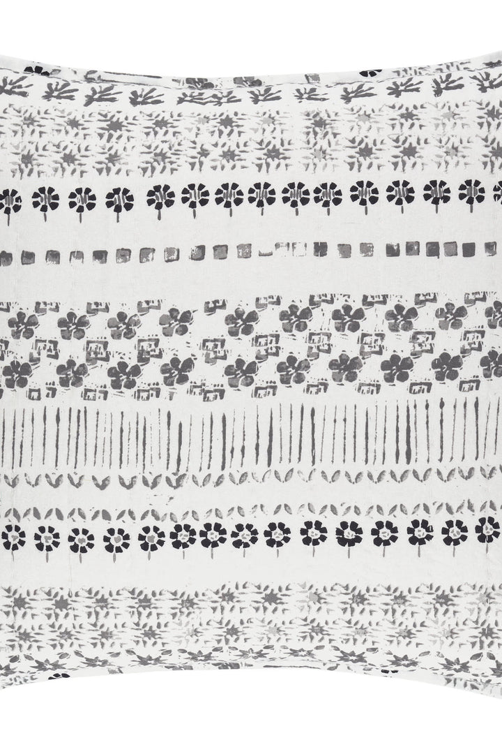 This lightweight 100% cotton quilted sham is adorned with sweet stripes of repeating floral motifs inspired by traditional Indian block prints. Tightly woven and washed down to a buttery-soft feel, digitally printed to reproduce the authentic nature of the artwork, and held together with a light Kantha stitch quilting. In Grey tones of Charcoal, Black, Warm Grey, and Silver on Ivory, it's a perfect layering piece that plays well with neutrals or brights.