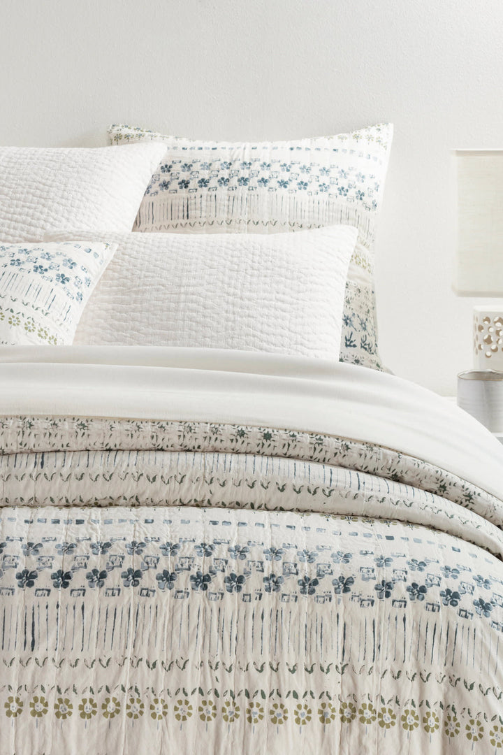 Inspired by traditional Indian block prints, this lightweight 100% cotton coverlet is adorned with sweet stripes of repeating floral motifs. Tightly woven and washed down to a buttery-soft feel, digitally printed to reproduce the authentic nature of the artwork, and held together with a light Kantha stitch quilting. In Grey tones of Charcoal, Black, Warm Grey, and Silver on Ivory, it's a perfect layering piece that plays well with neutrals or brights.