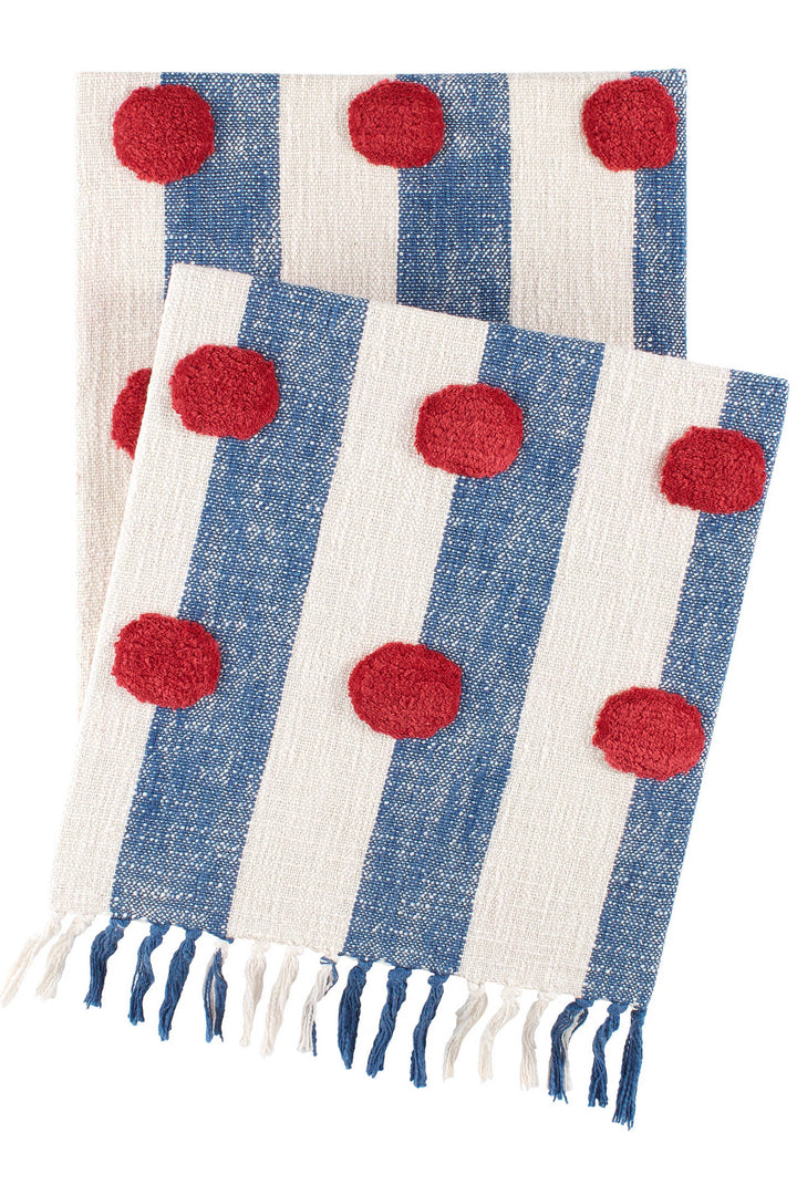 This cozy cotton throw is a whimsical spin on Nautical. Homespun slubby cotton is boldly striped in Denim and Ecru and accented with Red velvety dots of sheared French Knot embroidery. A hand-braided tassel fringe finishes the look.