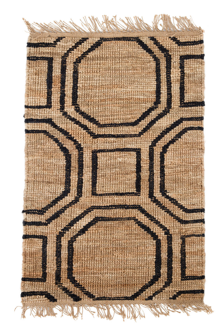 Interlocking inky tiles create soothing symmetrical shapes on a natural backdrop. Hardworking undyed jute is hand knotted for subtle texture and surprisingly soft surface interest, a modern and unique addition to any decor.