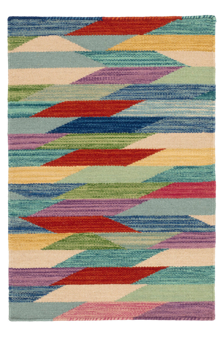 One of the timeless creations from the design collaboration between Annie and Kit Kemp, co-owner and Creative Director for Firmdale Hotels. Drawing inspiration from a one of a kind antique weaving, this incredible flatwoven wool rug contains over twenty colors, kilim woven together as geometric diagonally interlocking stripes. A myriad of marled shades from Soft Blue through Aqua to Sprout and Leaf create a harmonious composition with notes of Spice, Russet, Lavender, Coral and Gold. Annie and Kit are united by their passion for colorful and carefree design, redefining contemporary Arts and Crafts for everyday life.