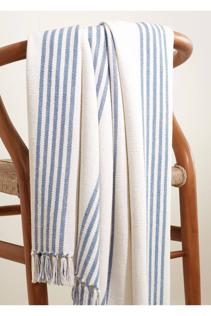 This cozy, casual throw is ready to go as an easy extra layer. It's as elegant slung over your shoulders as it is draped over a sofa or folded at the foot of a bed. Woven in soft washable cotton with a crisp accent of black stripes and a self-knotted fringe.