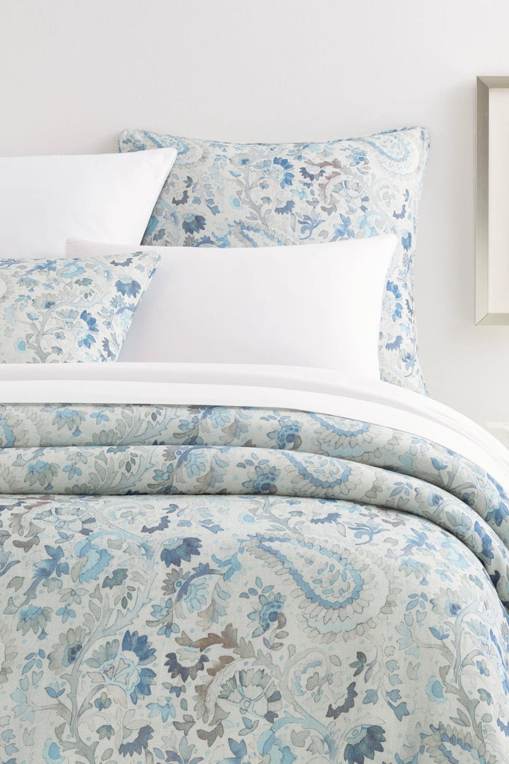 Ines Blue is easy to love; the rhythmic and lyrical paisleys, florals and foliage dance together in washes of blue, indigo and charcoal on a rustic laundered linen ground. Washed and tumbled for sublime softness and drape. Wake up to the colors of an ocean breeze and slip into the new day feeling refreshed and relaxed.