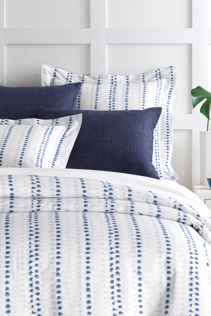 A minimalist, modern design in versatile ink blue on a crisp white cotton duvet cover: what could be easier? Multiple pairing possibilities, from solids to floras, stripes, abstract patterns, and everything in between. Sign on the dotted line for a stylishly stress-free slumber.