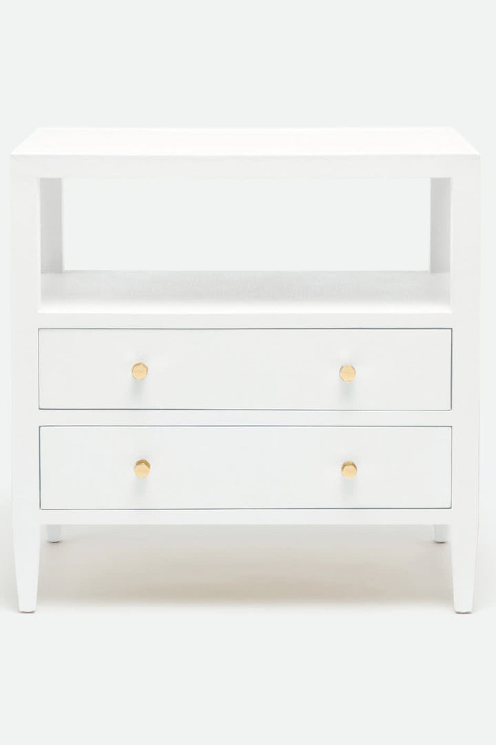 The simple silhouette and compact footprint belies ample convenient and discreet storage in this chic bedside nightstand. Two drawers rest in a hardwood frame with a warm white resin finish which is handcrafted in a multistep process. A faux fabric effect of Belgian linen gives texture and sheen to this charming piece that mixes well with upholstered furniture, making it a very appropriate addition for a farmhouse charm or coastal chic theme.