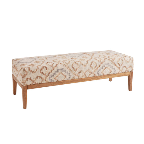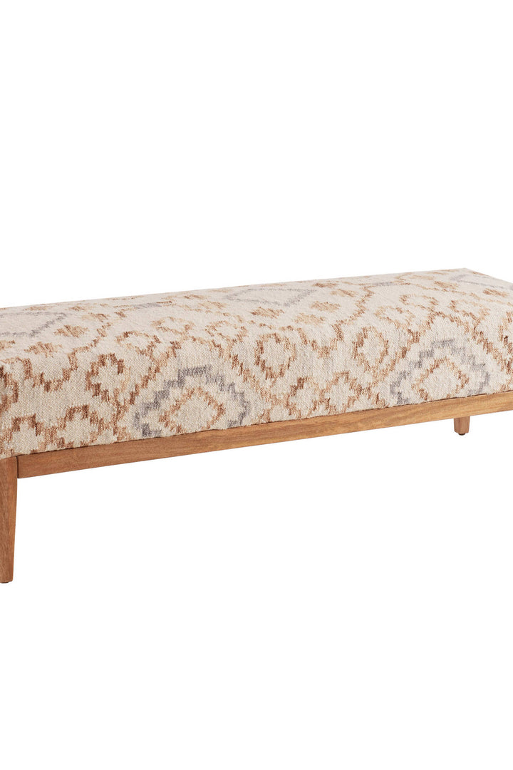 Part of our collaboration with Kit Kemp. Made of luxurious wool and handwoven by skilled artisans, this versatile bench is upholstered in one of our bestselling flatweave rugs. Featuring a wooden base and legs, it can serve as an ottoman, coffee table, or extra seating.
