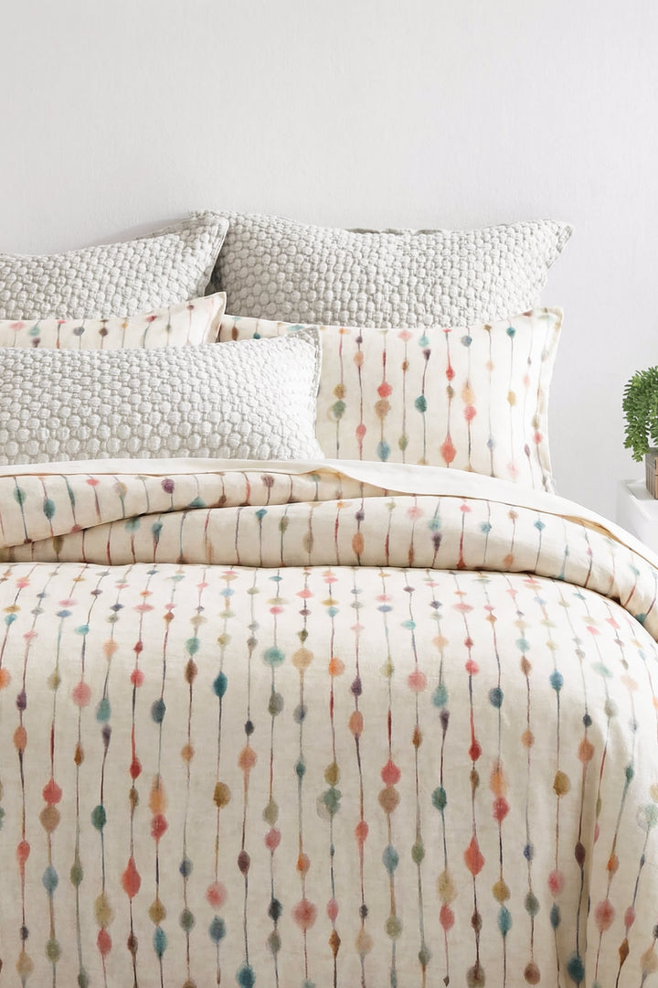 Bring a touch of soft, painterly charm to your bedroom with our Jessa Multi Duvet Cover. Inspired by an abstract watercolor study, this design features delicate drops of color drifting along slender vertical lines, creating a soothing rhythm that feels both artful and effortlessly relaxed. Printed on a natural cotton‑linen fabric, it pairs the airy texture of linen with the easy‑care comfort of cotton for everyday livability. Light, uplifting, and filled with gentle movement, Jessa transforms your space into a calm, color‑washed retreat with personality to spare.