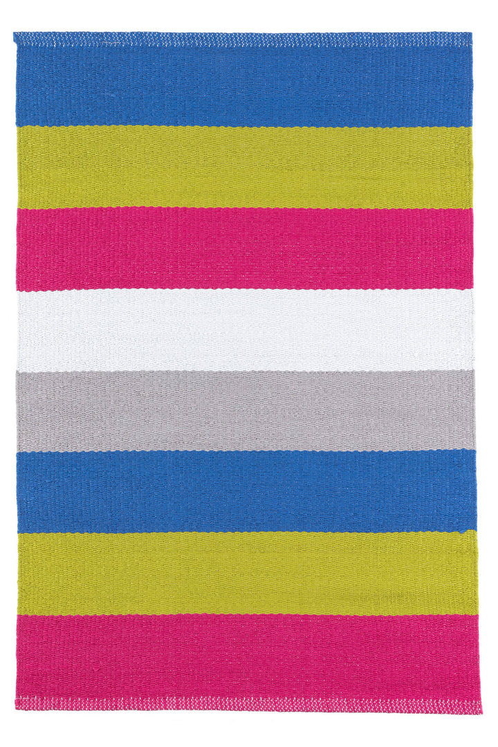You always know where you stand with this straightforward, horizontal, chunky-striped flatweave rug in French Blue, Sprout, Fuchsia, White and Grey. Available in a variety of modern markings, our latest matte PVC Indoor/Outdoor rug breed is light and dense with good stability. It lies flat and stays put with the look and feel of a natural fibre. Because it is water resistant, it exhibits the same easy clean up qualities, and stain and mildew resistance, as our other performance rugs.