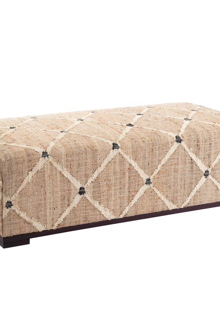Moroccan handwoven jute kilim rug featuring traditional diamond grid in striated neutrals, punctuated by a charcoal dot, covers all faces of this handsome ottoman bench available in two sizes.