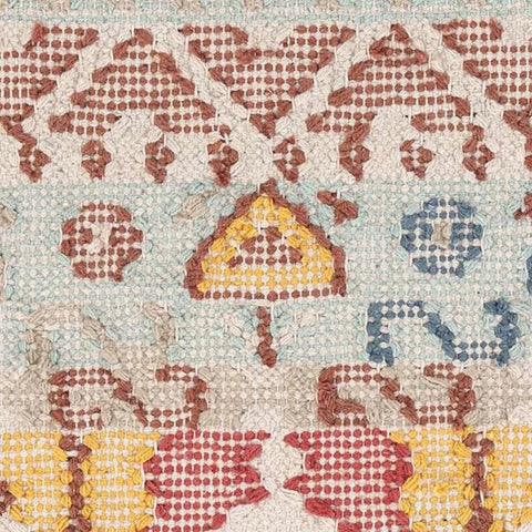 Handwoven by artisans in India, this low profile cotton kilim features linear zigzags and symbolic motifs in repeating pattern-stripes of red, wheat, sky, and espresso across the natural un-dyed ground. Rhythmic geometric sequences in warm hues unify the design, a seamless fusion of various aesthetics embodying distinctive symbolism of cultures past and present. Woven in cotton blend for comfort and durability, this striking rug is a modern fresh take on a hardworking favorite.
