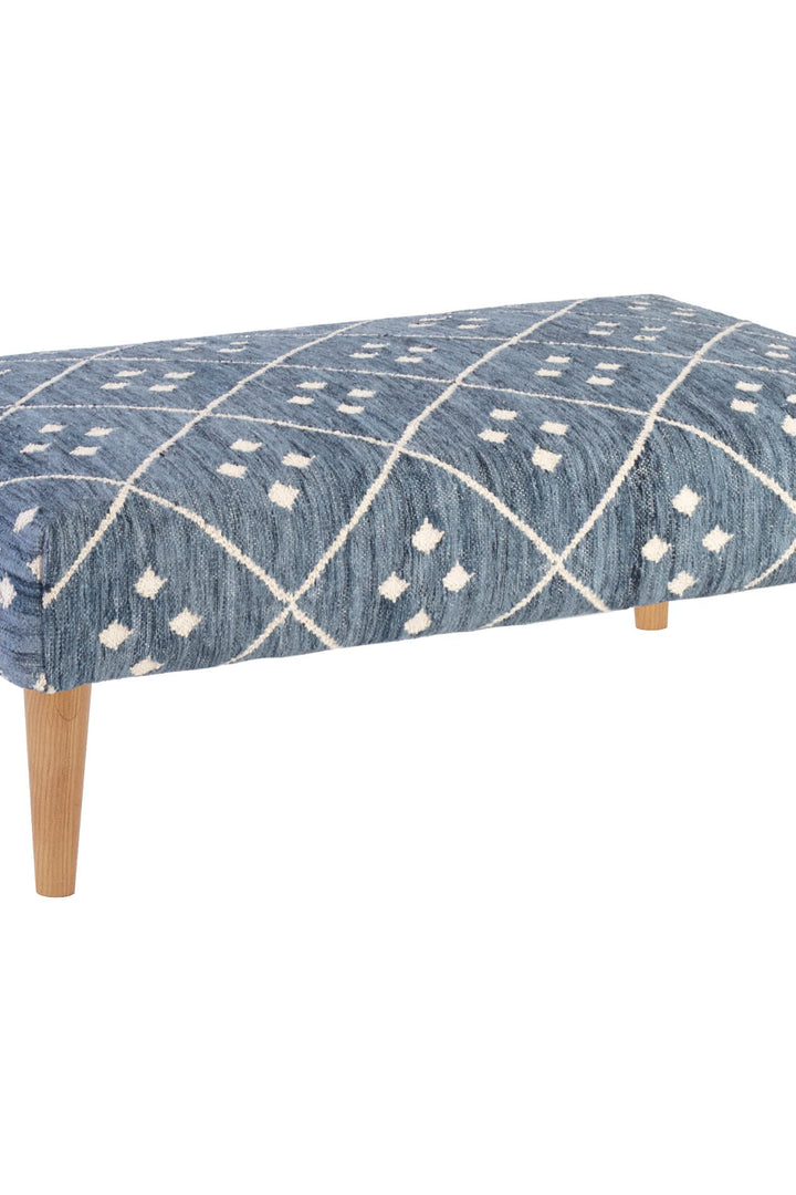 Get on the hot seat with our rug ottomans! Cushioned bench topped with a smashing Dash & Albert woven wool rug, with wooden legs in a walnut finish.