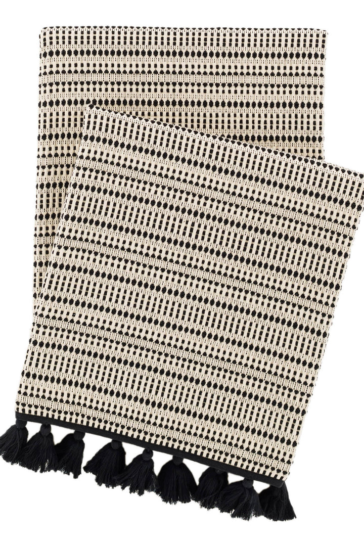 An allover tribal-inspired jacquard stripe repeats in black and white for a striking graphic statement for the modern interior. Fully reversible with the same design on both sides and black tassel fringe on length ends for a whimsical exotic touch.