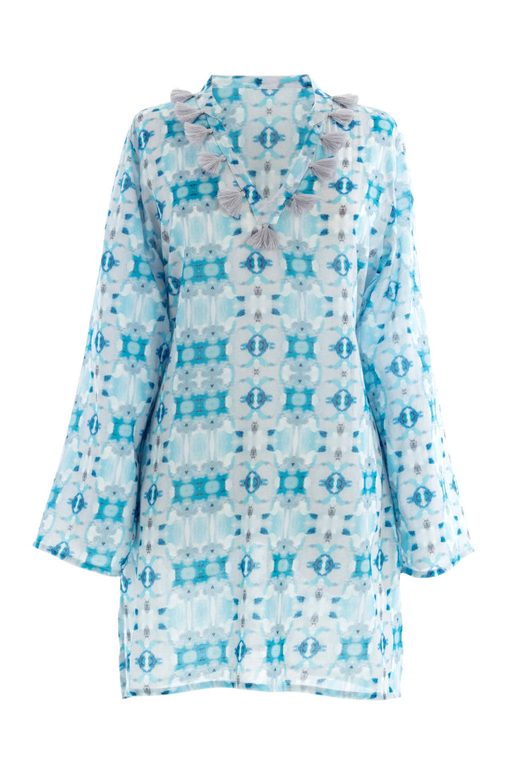 Our simple straight cut tunic is inspired by the Indian kurta, an eminently practical garment evolved over millennia for gracefully navigating the summer heat. What better prints to offer it in then, but our collection of fresh and bright kaleidoscopic repeats developed from the original art of Laura Park. Easy to wear and eminently comfortable in cotton voile, and trimmed with transfixing tassels at neck and placket.