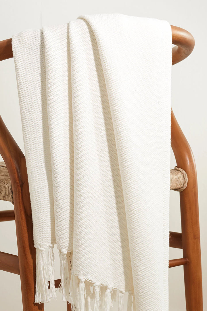 A soft and snuggly addition to the perfectly layered bed, arm chair or sofa, our pure cotton Logan Throw has a float stitch weave for extra insulating qualities. With a knotted self fringe along the width edges, it can make a bold and sophisticated bohemian texture statement. In Dove White or Sand.