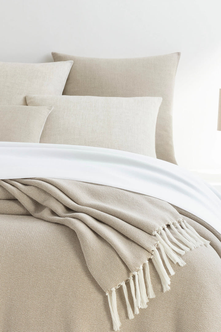 A soft and snuggly addition to the perfectly layered bed, our pure cotton Logan Blanket has a float stitch weave for extra insulating qualities. With a knotted self fringe along the width edges, it can make a bold and sophisticated bohemian texture statement. In Dove White or Sand.