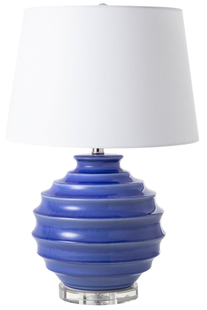 Ideal for adding a sophisticated pop of color to any space, this table lamp is crafted of a glossy ceramic globe with a distinctive, ridged texture sitting on a round crystal base. A neutral linen blend shade completes the design. Available in Blue, Green or White.