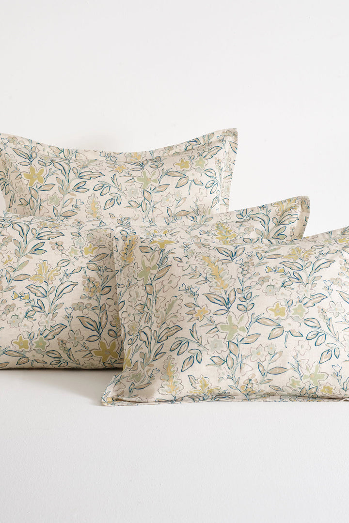 The Macie Blue/Green Sham brings a breath of fresh air to your bedroom. Inspired by a one-of-a-kind watercolor painting our designers discovered and loved, this botanical print weaves sage, sky, and navy florals across a soft cotton/linen flax blend. The natural, undyed background adds an effortlessly chic touch.