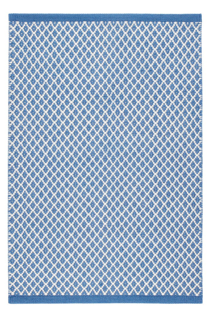 A classic lattice diamond in versatile blue and ivory color combo offers subtle geometric interest on a durable and washable floor covering. Made of eco-friendly 100% PET, a soft-handed fiber from recycled plastic bottles.