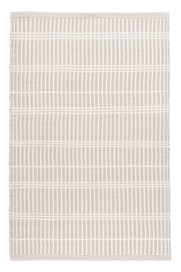 This bold, low profile, and tightly-woven rug is a stylish and sophisticated take on subtle patterning. Delicate, end-on-end mini stripes are intersected by intermittent bars of ivory overlay. Made of durable polypropylene and terrific for high-traffic areas, this washable, scrubbable, and bleachable indoor/outdoor rug will stand up to all that you dish out for years to come.