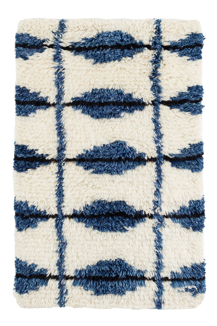 Sumptuous and shaggy, the Noma Handwoven Wool Rug has a plush pile of undulating ivory tufts with an ink-colored diamond design. The perfect rug for adding softness and style to a bedroom, living room, or family room.
