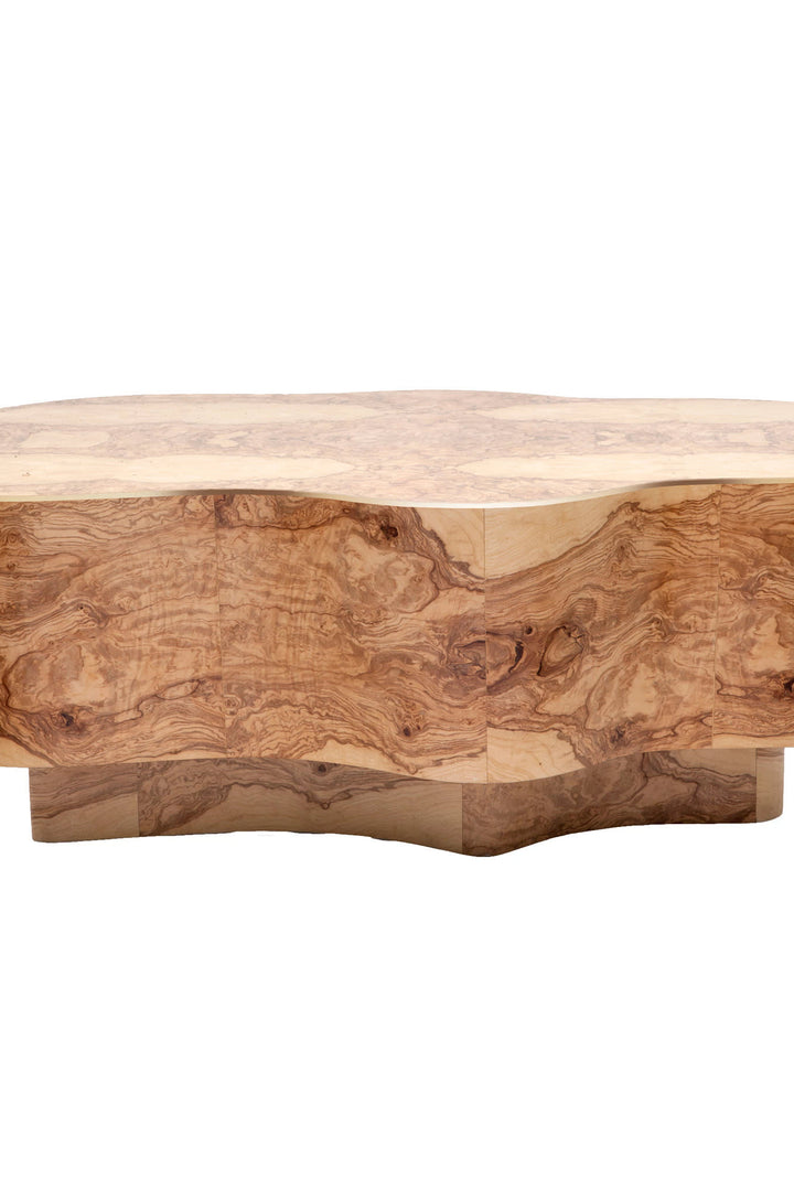 Make a statement without saying a word: this colossal coffee table speaks for itself. Its modern form clad in olive ash burlwood veneer gives it an air of vintage chic. It won't fail to be the focal point of the room with its undulating edge, cumulus grain and monumental mass.