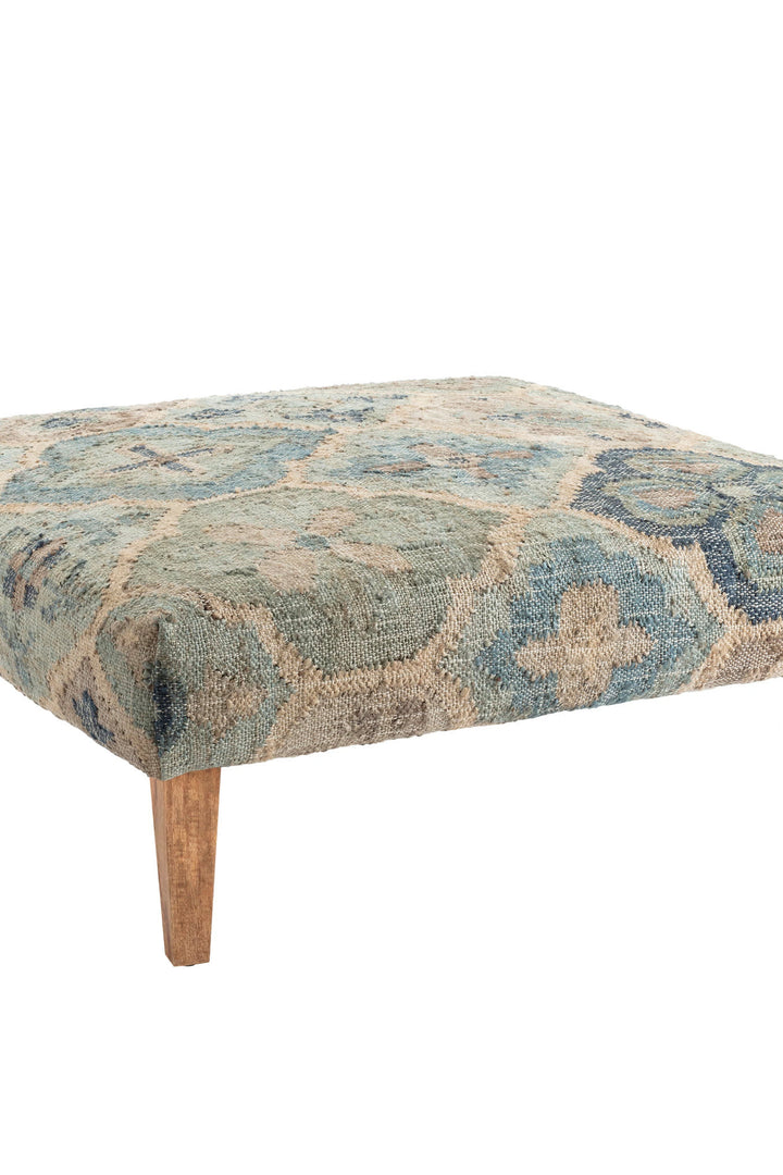 Love our Pali Handwoven Jute Rug? Reimagined and upholstered from one of our favorite rugs, this ottoman becomes a contemporary collectible. Attractively upholstered in quatrefoil medallions in shades of denim, natural and ivory, woven in hardworking jute, with a touch of cotton for softness. The cushioned ottoman is held aloft by a choice of shapely turned-wood legs in a variety of finishes. An ideal placement for front of sofa or end of bed, doing double duty as occasional seating and staging area for a tray. This supersmart addition to entryway, living room or bedroom is a versatile investment piece, available in two sizes.