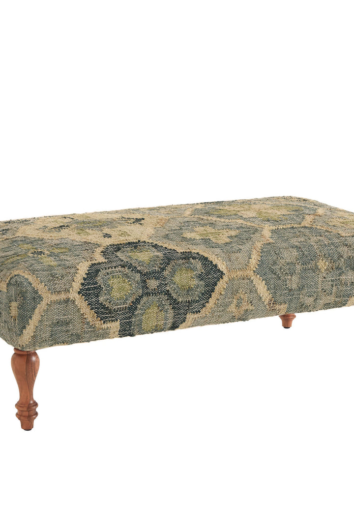 A linear upholstered form paired with one of our favorite rugs transforms this ottoman bench into a contemporary collectible. Attractively upholstered in quatrefoil medallions in shades of sky, denim, natural and ivory, woven in hardworking jute, with a touch of cotton for softness. The cushioned bench is held aloft by a choice of shapely turned-wood legs in a variety of finishes. An ideal placement for front of sofa or end of bed, doing double duty as occasional seating and staging area for a tray. This supersmart addition to entryway, living room or bedroom is a versatile investment piece, available in two sizes.