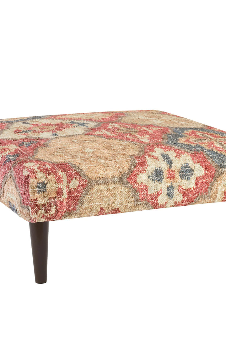 Love our Pali Handwoven Jute Rug? Reimagined and upholstered from one of our favorite rugs, this ottoman becomes a contemporary collectible. Attractively upholstered in quatrefoil medallions in shades of denim, natural and ivory, woven in hardworking jute, with a touch of cotton for softness. The cushioned ottoman is held aloft by a choice of shapely turned-wood legs in a variety of finishes. An ideal placement for front of sofa or end of bed, doing double duty as occasional seating and staging area for a tray. This supersmart addition to entryway, living room or bedroom is a versatile investment piece, available in two sizes.