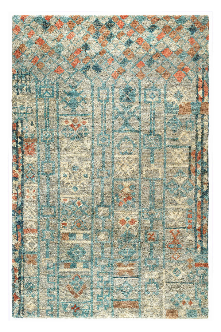 Soft, mellow, vintage appeal of expressive patterning in random formations and faded once-rich coloration, recalls the traces of buried memories that bring one to a sense of home and comfort. A unique rug, Silver, Natural, Indigo and Spice tones hand knotted, tufted and sheared with a high pile in sustainable jute.