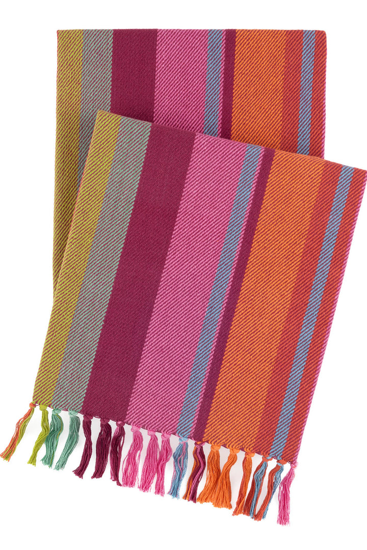 Find your place of perfect happiness with this striped, twill weave cotton throw in a colorful confluence of treasure trove colors. Bring the heat, with sizzling stripes of Burnt Orange, Cerise, Cereulean Blue, Turquoise and Chartreuse. The perfect companion for fireside reading or snuggling-up on the deck and watching the sun go down.