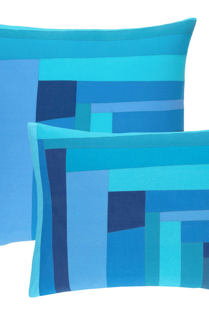 A lush, modern take on colorblocking, this medley of shapes and colors are an homage to the traditional Log Cabin patchwork design. Irregular cotton fabric strips in Royal, Navy, Turquoise, Denim and Aegean are pieced together for a vibrant addition to any bed or seat in both square or boudoir shapes. This season Annie has teamed up with Victoria Van Der Laan of The Binderie in the Hudson Valley to create a fabulous capsule collection of pillows and quilts.