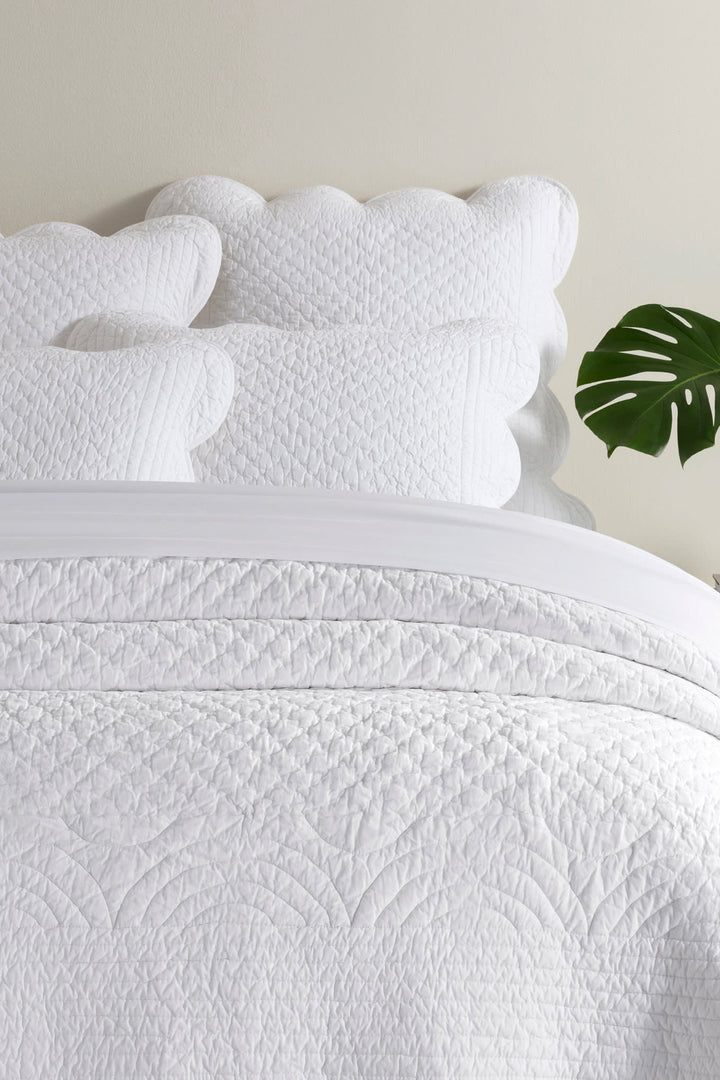 Start your day right with a Boutis inspired modern version of Grandma's clean and fresh, all white needleworked quilt and sham. Scalloped edges border crisp, concentric channels of stitching, comforting, cottony and cozy, evoking simpler more innocent days. Becomes the perfect, lightly textured foundation for an all white bed, or to pile on an exuberance of colorful pillows and throws.