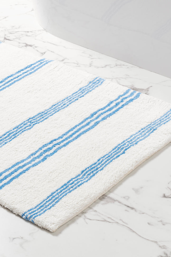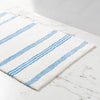 A better pick-me-up than that morning cup of joe: Step out of the shower and be greeted by one of our favorite stripes! Elegant and understated ticking stripes on a white ground are inspired by our classic Swedish Stripe flatwoven cotton rug. Available in Coral, French Blue or Shale on White ground. Densely tufted for cloud-like softness underfoot from a densely plush and substantial long-staple cotton.