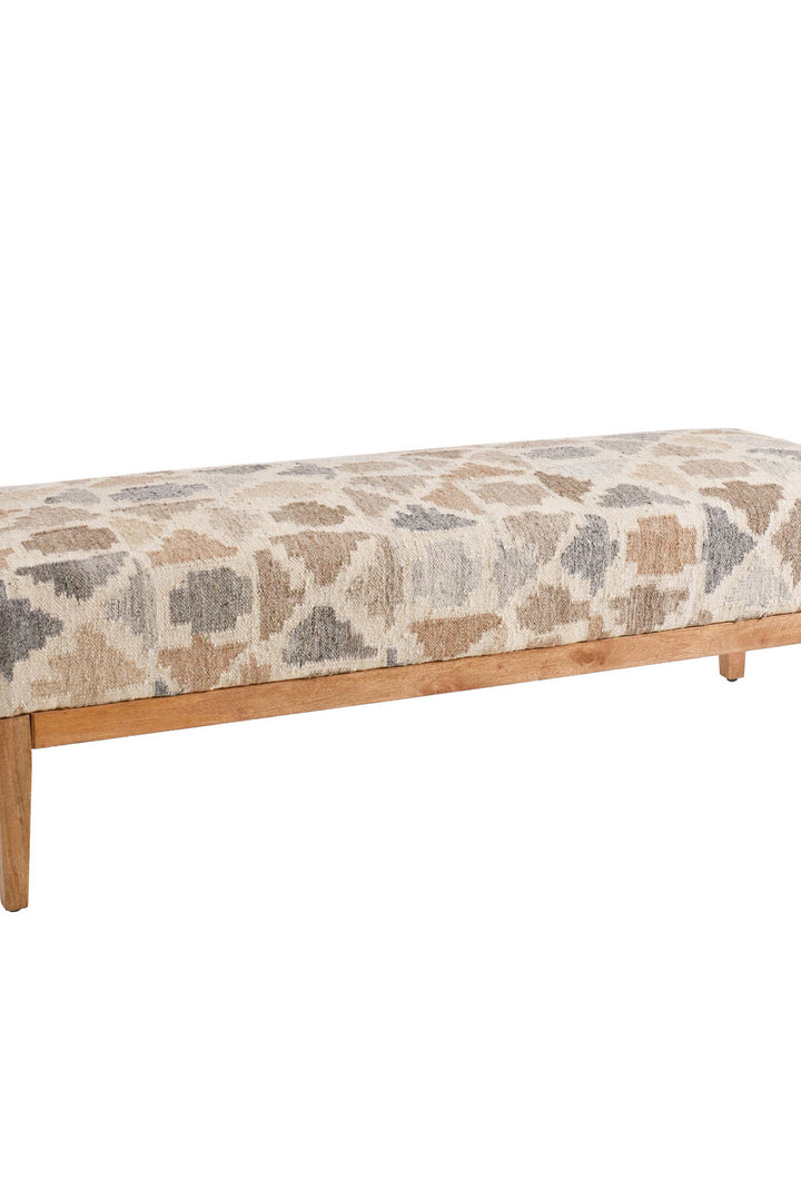 Part of our collaboration with designer and hotelier Kit Kemp. Made of a flatweave kilim rug with a diamond and pyramid motif, this versatile bench features a handsome wooden base and legs. It can serve as an ottoman, coffee table, or extra seating.