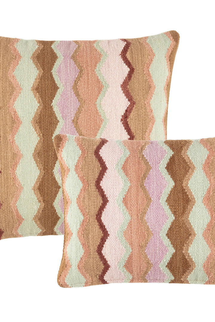 Foundational geometric rik-rak lines encapsulate atmospheric tonal hues, reflecting the everchanging light on the ocean, as colors shift according to season, and time of day. Each unique colorway is interpreted to create a bold presence in a room without overpowering it. Kilim flatwoven wool rug cushions, inspired by the hand-knotted fishing nets flung over the sides of boats in the harbors of Barbados. Designed by Kit Kemp, co-owner and Creative Director of Firmdale Hotels, in a collaboration with Annie Selke.