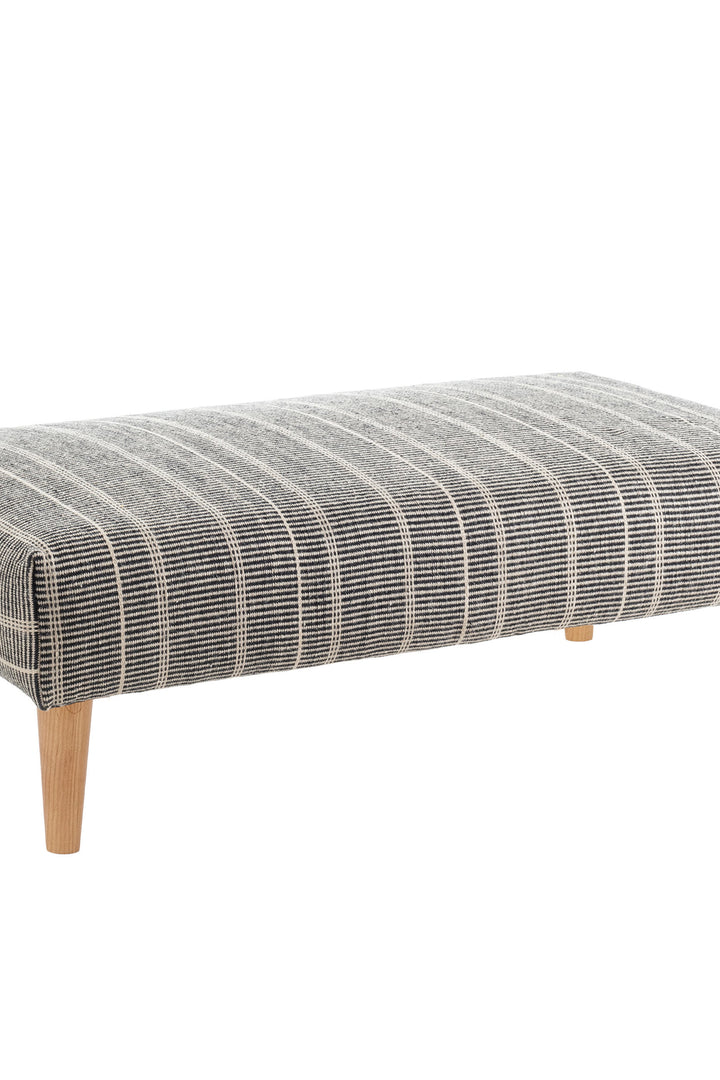 The Samson Handwoven Indoor/Outdoor Rug is now available as an ottoman. This bestselling striped design from our Bunny Williams collection is inspired by an antique rug sample from the designer's own personal collection. The cushioned ottoman is held aloft by a choice of shapely turned-wood legs in a variety of finishes. An ideal placement for front of sofa or end of bed, doing double duty as occasional seating and staging area for a tray. This supersmart addition to entryway, living room or bedroom is a versatile investment piece, available in two sizes.