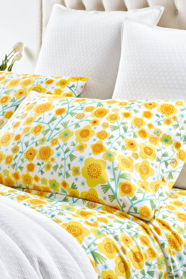 Let the sunshine in with this riot of golden sunflowers. Digitally printed on crisp white cotton percale, this exuberant sheet set will keep you comfy and cool with its soft, breathable weave and vibrant, happy colors.