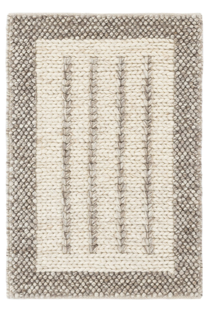 Gorgeous natural undyed wool rug has a lighter grey plaited weave center with parallel railroad braided stripes inside and a pebble border. The Sorrel woven wool rug is part of Bunny William's latest capsule collection for us, inspired by the unique geometric Kuba weaving of central Africa. Mathematical and rhythmic designs that evolved from a number of techniques featuring braiding, twill weaving, flat weaving, and cut pile, with patchwork, embroidery, and appliqué. This modern and timeless rug is sophisticated, durable and practical, and perfect for high traffic areas.