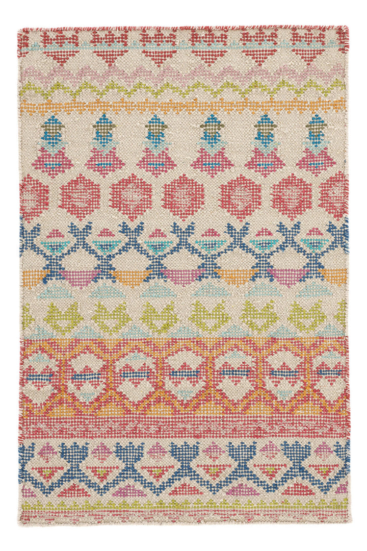 Loom knotted cotton flatweave rug features unique and pretty Fairisle motifs woven in a Birdseye technique, which beautifully mutes and washes down the lively palette of Orange, Leaf, Denim, Fuchsia, Red and Soft Pink. Enhanced durability is an added bonus delivered by its special woven structure.
