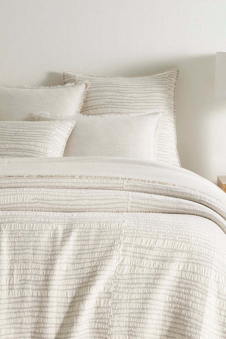 Classic cotton matelassé bedding gets a sophisticated update. Broken stripes of barred striations, inspired by natural rock formations, are jacquard woven with slightly thicker cotton yarn with a subtle sheen. This distinctive coverlet is expertly woven and tailored in Portugal. Laundered for lived-in comfort and offered in a distinctive range of saturated mineral neutrals. A modern sensibility is expressed through traditional craftsmanship by Marie Flanigan, the architect, designer, Founder, and Principal of Marie Flanigan Interiors. Part of a design collaboration that reflects Marie's timeless elegance and innovative simplicity.