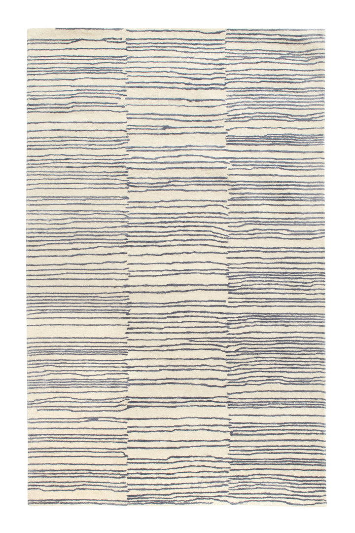 Wide swaths of broken lines in bi-chromatic neutrals create rhythmic partitions across this sophisticated wool rug. A velvety sheared wool pile contrasts and enhances the finely observed sheen of the brindled bars in a softly toned mineral palette. Inspired by striated grooves in rock formations caused by the movement of glaciers, or newly erupting lava, pushing through cooling rock. A modern sensibility is expressed through traditional craftsmanship by Marie Flanigan, an award-winning interior designer. This luxurious wool rug is is a part of our design collaboration with Marie to produce a lifestyle collection that reflects her signature style of timeless elegance and innovative simplicity.
