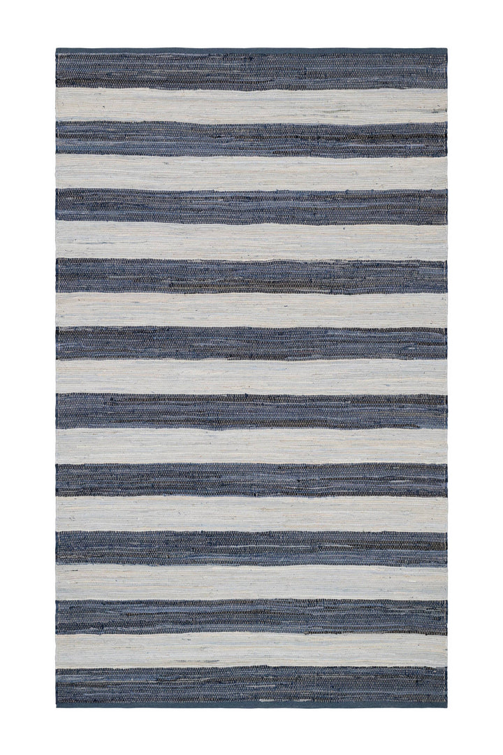 This casual cotton rag rug will bring comfortable, underfoot cushioning and soft texture to the kitchen, bath, or playroom. Boldly striped with dark wash and faded denim recycled fabric offcuts, each hand-loomed rug is unique. Densely woven and double-sided for longer life.