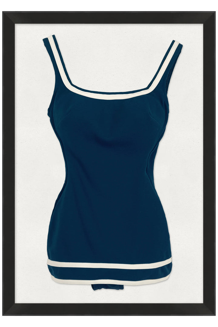 Vintage Deauville-style one-piece swimsuits in navy and white set the scene for coastal style with a splash of glamor. Giclee photographic prints add graphic interest and a whimsical humor. Hang singly or group the series for maximum impact.
