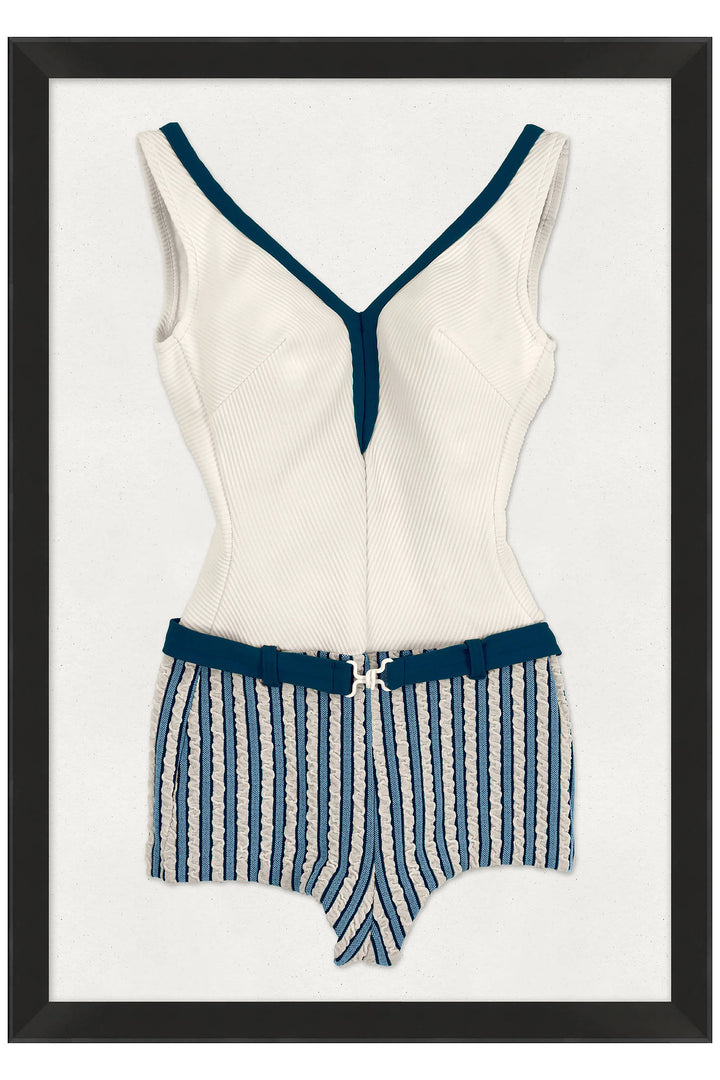 Vintage Deauville-style one-piece swimsuits in navy and white set the scene for coastal style with a splash of glamor. Giclee photographic prints add graphic interest and a whimsical humor. Hang singly or group the series for maximum impact.