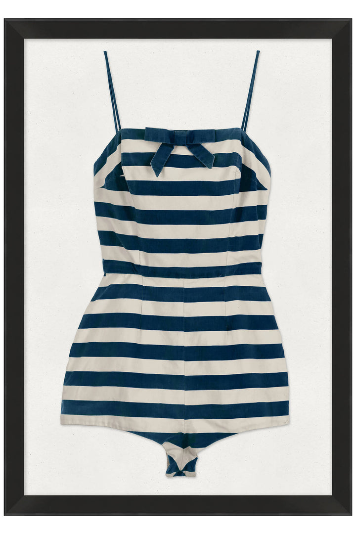 Vintage Deauville-style one-piece swimsuits in navy and white set the scene for coastal style with a splash of glamor. Giclee photographic prints add graphic interest and a whimsical humor. Hang singly or group the series for maximum impact.