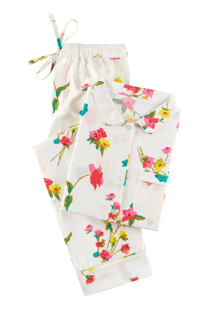 This sweet and colorful posies print, lifted from a vintage dress, makes for a zany take on cottage-core pajamas. Cut for comfort in our "boyfriend PJ" shape. The top is detailed with sophisticated self-piped accents on the rounded Peter Pan collar, patch pockets, and cuff hems. The squared-off, boxy silhouette extends to the high hip. Pull-on pants have an elastic waist with a self-tie. Beautifully printed on our deliciously dense and drapey Silken Solid sateen weave.