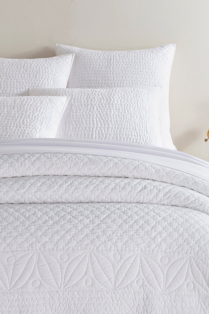 Start your day right with a Boutis inspired modern version of Grandma's clean and fresh, all white needleworked quilt. Crisp channels of mitered stitching border a central body of leaf motifs, comforting, cottony and cozy, evoking simpler more innocent days. Becomes the perfect lightly textured foundation for an all white bed, or to pile on an exuberance of colorful pillows and throws.