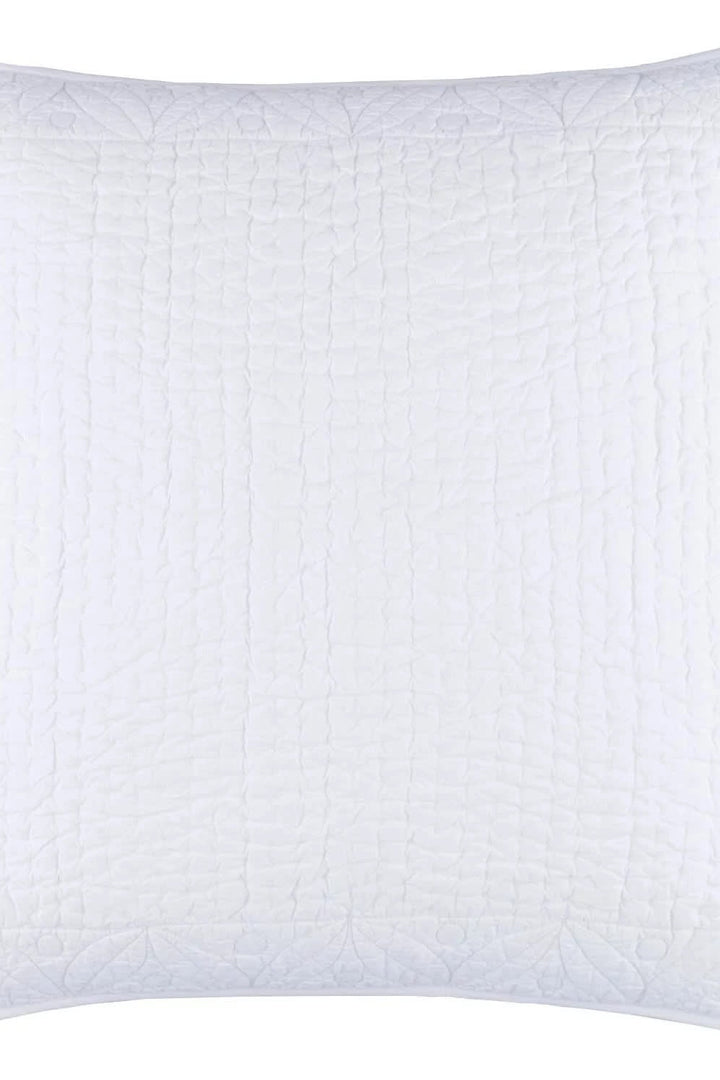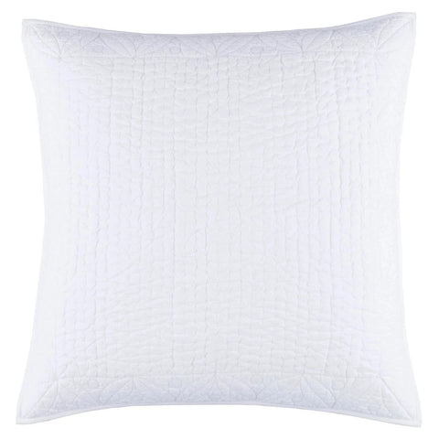 Boutis inspired modern version of Grandma's clean and fresh, all white needlework. Crisp channels of mitered stitching border a central body of leaf motifs, comforting, cottony and cozy, evoking simpler more innocent days. This sham becomes the perfect lightly textured addition to an all white bed or sofa.