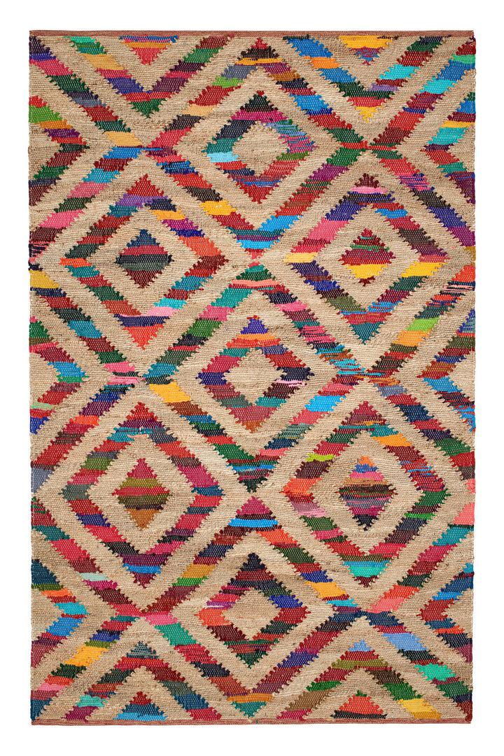 As radiant as a stained glass window, strips of cutting room scraps get a second chance to shine as they weave through a natural jute ground. Each handwoven rug has a unique placement of rainbow colors in a bold geometric pattern, enhancing its beauty. Guaranteed to light up your floor, this sustainably produced cotton, and jute rug ticks all the boxes.